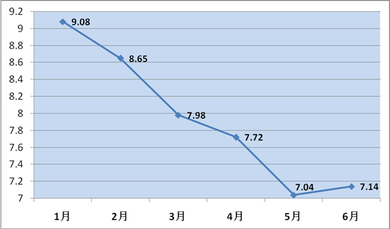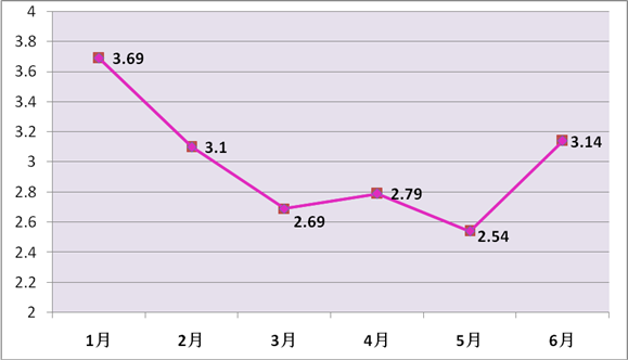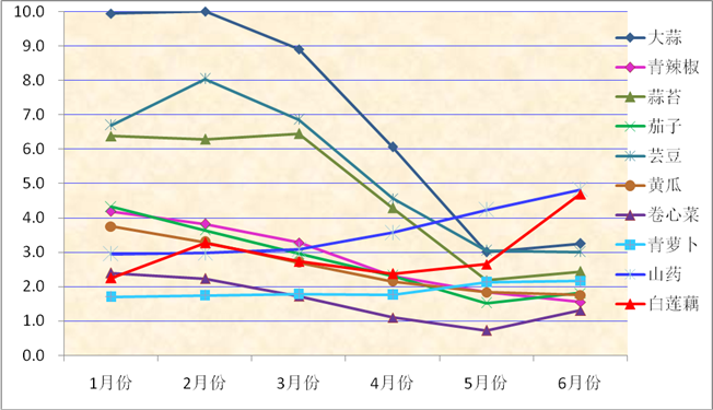 2017上半年集贸鸡蛋均价(元/斤) 鸡年开年,鸡蛋在“本命年”价格陷入冰点,价格自春节前夕开始持续走下坡路,价格断崖下跌之势实为近20年来罕见。春节刚过,集贸蛋价呈现出深跌行情,跌至2.6元/斤,此后近一个月时间,蛋价深陷低谷。进入3月份,鸡蛋市场开始呈现企稳势头,在清明节日需求提振下月底价格小幅上涨,清明节后蛋价再次回落,5月下旬价格再次刷新新低价2.4元/斤,此后蛋价缓慢回涨。6月下旬,市场迎来一波暴涨行情,鸡蛋零售价每斤从2.6元直线涨至4元,但由于缺乏终端需求的实质性提振加之各环节抵触高价,月底价格再度回落至3.6元。鸡蛋供大于求是造成上半年市场价格大起大落的主要原因。2014年开始,鸡蛋价格持续走高,养殖户连续3年盈利,饲养积极性高涨,出现大规模补栏、扩栏现象。在政策支持下,近两年部分地区建设投产存栏量在10万羽以上的标准化养殖场,且近三年全国没有爆发大规模疫情,蛋鸡鸡群未出现大面积死亡现象,综上,蛋鸡存栏量只增不减,导致鸡蛋供应过剩,价格跌破养殖成本线。 (五)“菜篮子”物丰价廉,菜价较去年同期有所回落