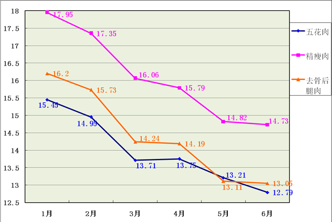 2017年上半年生猪出栏均价(元/斤) 相比去年春节后,生猪出栏价一路飙涨,而今年春节余温未退,生猪出栏价已呈现断崖式下跌,2月初生猪出栏价每斤从9元跌至8.5元。进入3月,随着养殖户集中出栏,市场阶段性供应宽松,生猪出栏月均价跌至7.98元/斤。5月份下旬生猪出栏价迎来近2年来最大降幅,以6.7元/斤的价格刷新了自2015年4月底以来连续25个月的新低,在时隔16个月后,猪粮比由红色预警区域回归绿色安全区域。进入6月份,经过前段时间大猪出栏消化,养殖户存栏压力减小,加之受市场行情回暖支撑,部分养殖户再度压栏观望,助推生猪出栏价年中翘尾,回归七元区。去年以来生猪养殖户补栏热情较为高涨,今年上半年生猪产能恢复加快,市场供应充足,面对需求持续疲软,屠宰企业持续压价,猪价缺乏供需基本面的支撑,上涨乏力,尤其五一后天气愈热,生猪需求进入淡季,加剧供需矛盾。 2、肉类价格进入下行通道。