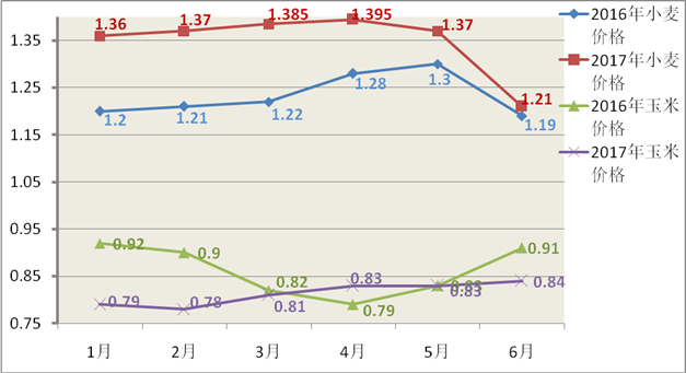 2017年上半年小麦、玉米价格走势图(元/斤) 1、小麦价格高位企稳,行情向好。今年上半年小麦价格延续去年年末涨势,价格明显高于去年同期。春节后随着市场流通粮源不断消耗,小麦供市量开始偏紧,3、4月份价格持续攀升,优普麦价差进一步拉大。随着国储2016年小麦5月16日投市和新季小麦由南向北陆续上市,小麦市场前期供应紧张的局面略有缓解,市场价格出现松动,6月份我区新麦集中上市,价格 “高开高走”,开秤价格较去年同期普遍偏高0.03-0.06元/斤,后期售粮高峰结束价格逐步企稳。 2、玉米价格低谷徘徊,回暖艰难。春节过后,伴随基层余粮集中放量加之养殖需求进入传统淡季,我区玉米迎来新一轮“跳水”行情。3月份,受国家对玉米加工企业补贴政策支撑,玉米价格触底反弹,但面对养殖淡季,淀粉价格频频走低,玉米价格上涨始终乏力。进入5月份国储玉米拍卖抛售,市场优质粮源供应紧张,拍卖成交价偏高支撑维系玉米价格。进入6月,多数经销商暂停玉米收购,腾库收购新麦,玉米市场供应下降,价格微涨,在饲料及玉米深加工企业需求依旧疲软下,玉米价格打翻身仗难上加难。 (二)粮油价格小幅回落,整体价格走势较为平稳 走访我区齐都花园市场和临园市场了解到,受上游小麦、花生、大豆等粮食成本及终端消费低迷制约,除面粉外,今年上半年部分粮油价格稳中有降,销量整体不佳。受小麦价格上涨影响,面粉(标准粉)价格稳定在2元/斤,较去年上半年1.8元/斤上涨11.1%,面条价格维持在2.2元/斤,较去年同期2元/斤上涨10%。由于进入二季度花生仁价格由8元/斤跌至6元/斤 ,鲁花花生油从一季度137元/5L累计跌至135元/5L,6月下旬价格再次回落至130元/斤,累计跌幅5.1%。金龙鱼大豆油基本保持稳定,一季度均价40元/5L,进入6月份价格小幅跌至39元/5L,跌幅2.5%。从粮油商户处了解到,受大型商超促销及电商、微商等销售渠道冲击,上半年粮油销量延续下滑走势,实体零售店进入寒冬,尤其是小型粮油店面临关停窘境,尤其6-8月份粮油行业进入销售淡季,粮油市场行情难有改善。 (三)生猪回归绿色区间,肉类价格亲民 1、生猪出栏价难现火爆行情。
